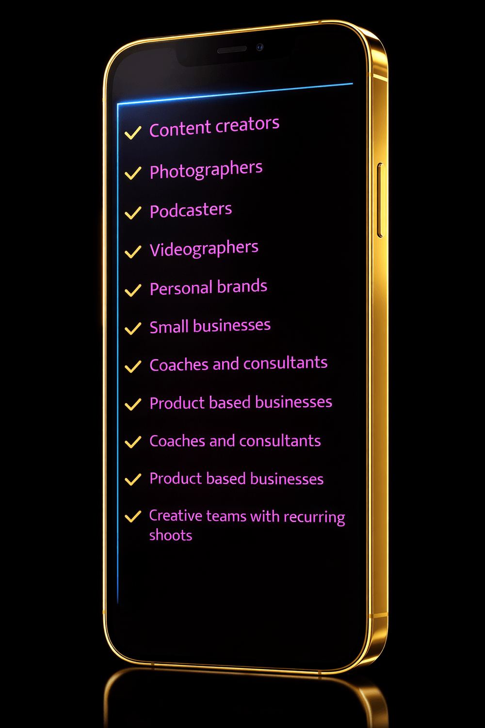 Perfect for content creators, photographers, podcasters, personal brands, and small businesses that need recurring studio access for shoots, campaigns, meetings, and more.